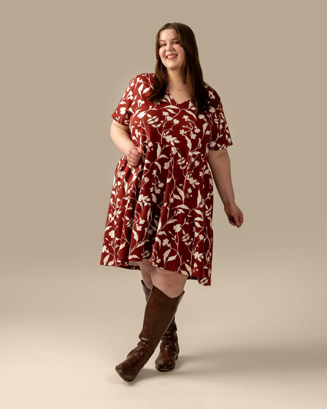 Kaunis lyhythihainen V-kaula-aukkoinen mekko Toiven Shadows Mahogany -kuosissa. Kevyesti rypytetty helma tuo mekkoon keveyttä ja liikkuvuutta. Monipuolinen valinta arkeen ja juhlaan.