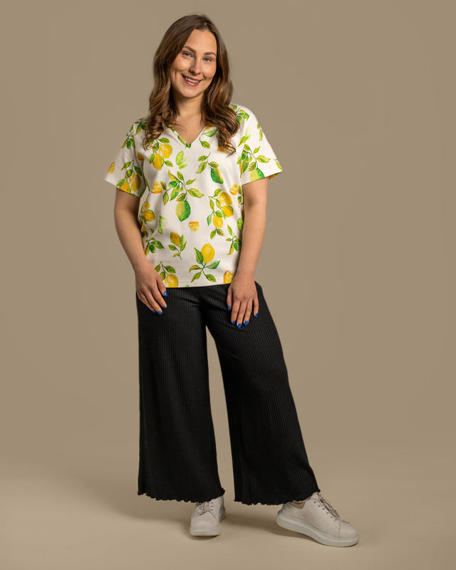 Tämä elinvoimainen keltainen V-kaula-aukkoinen t-paita sisältää erottuvan sitruunapainatuksen, joka on valmistettu hengittävästä puuvillasta optimaalisen mukavuuden takaamiseksi lämpimällä säällä. Kesäinen muotoilu tarjoaa sekä tyyliä että toimivuutta, tehden siitä välttämättömän lisän kausivaatekaappiisi.