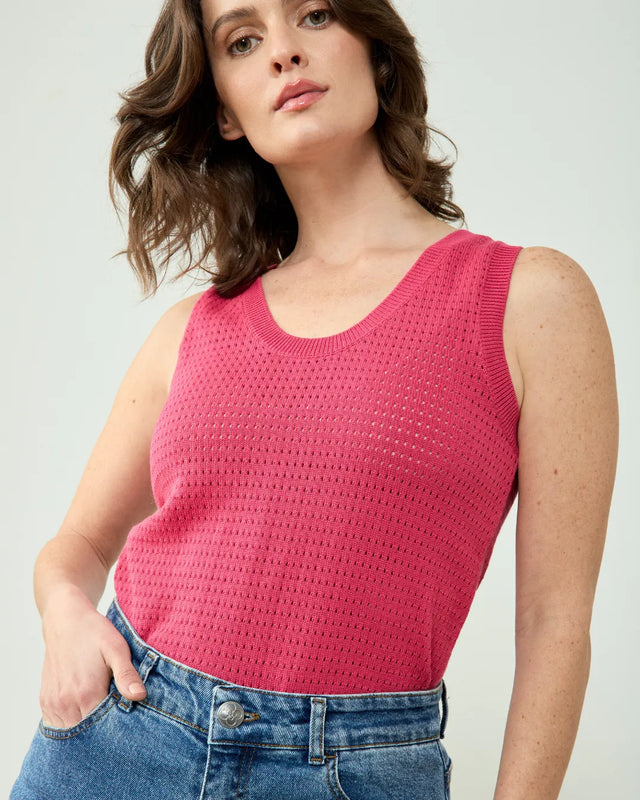 A versatile magenta knit crafted from 100% organic cotton in a family-run Cuenca workshop. The reversible design offers dual styling options—wear the neckline forward or reversed for distinct looks. Its open-knit construction delivers breathability and softness, while the vibrant hue complements all complexions.