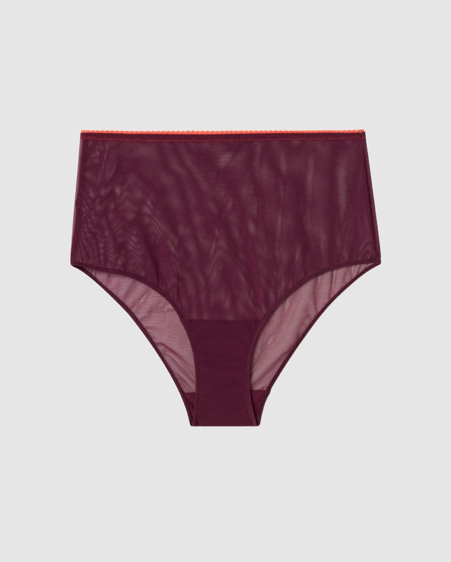 Korkeavyötäröiset alushousut, jotka on valmistettu läpikuultavasta verkkokankaasta. Korkea vyötärö, joka ulottuu juuri navan alapuolelle. Täysi peittävyys takapuolella imartelevaa istuvuutta varten. Ohuet kuminauhat vyötärönauhassa ja lahkeensuissa