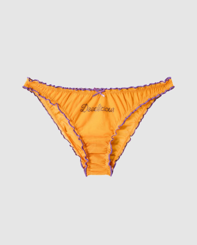 Keskikorkeat alushousut, joissa on korkealle leikattu jalkaosa läpikuultavasta verkosta, koristeltu strassikivillä, jotka muodostavat "Deeelicious" leikkisäksi yksityiskohdaksi. Reunat on rypytetty kontrastivärisellä babylock-viimeistelyllä. Ohut kuminauha vyötärönauhassa ja jalan aukoissa. Suloinen satiinirusetti edessä.