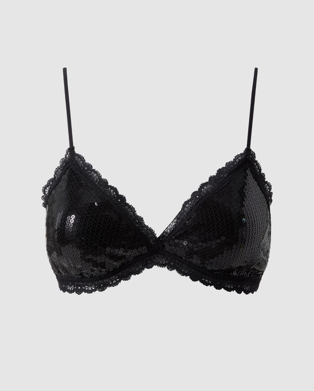Ashish x Understatement suunnitteluyhteistyö. Läpinäkyvä verkko, koristeltu kauttaaltaan säihkyvin paljetein. Verkkovuori mukavaan, hienovaraiseen peittoon. Kolmionmuotoiset kupit, joissa on herkät pitsireunukset. Ohuet, säädettävät olkaimet ja säädettävä hakas- ja silmukkakiinnitys takana.