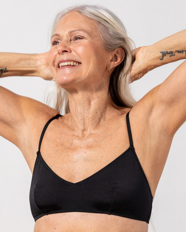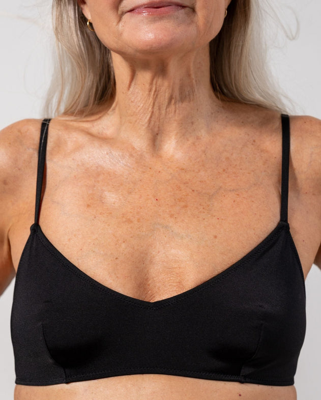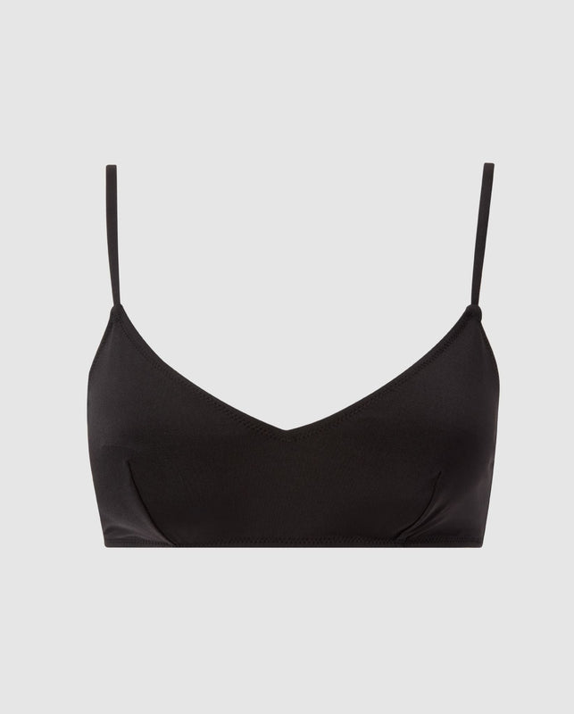 Puhdasta linjaa, ajaton tyyli. Kiiltävää uimapukukangasta, joka on valmistettu kierrätetystä polyamidista. Kaareva bikinien yläosa, jossa on säädettävä takakiinnitys. Ohuet, säädettävät olkaimet täydellistä istuvuutta varten. Painettu Understatement logo takana.