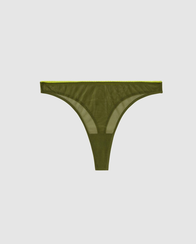 Ohut mesh-thong, jossa on kaareva vyötärö ja keski-korkea istuvuus, jota voidaan käyttää korkealla vyötäröllä tai alempana lantiolla. Kontrastoiva picot-joustin vyötäröllä ja ohuet joustimet lahkeiden aukoissa.