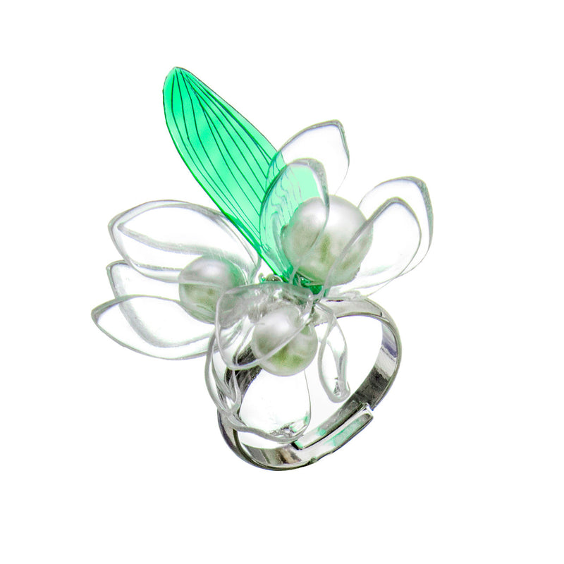 Sormus on käsintehty Helsingissä käyttäen kierrätettyjä muovipulloja terälehtiin ja lehtiin.