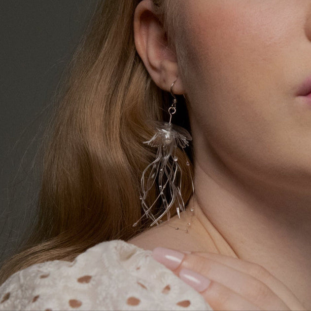 Koe Meduusa-korvakorujen vangitseva viehätys Upcycle with Jing:sta. Näiden korvakorujen vaikutteet tulevat rauhallisesta merimaisemasta, ja niissä on hienostuneita kuvioita, jotka muistuttavat siroja meduusoja, huolellisesti käsin tehtyjä täydellisyyteen.