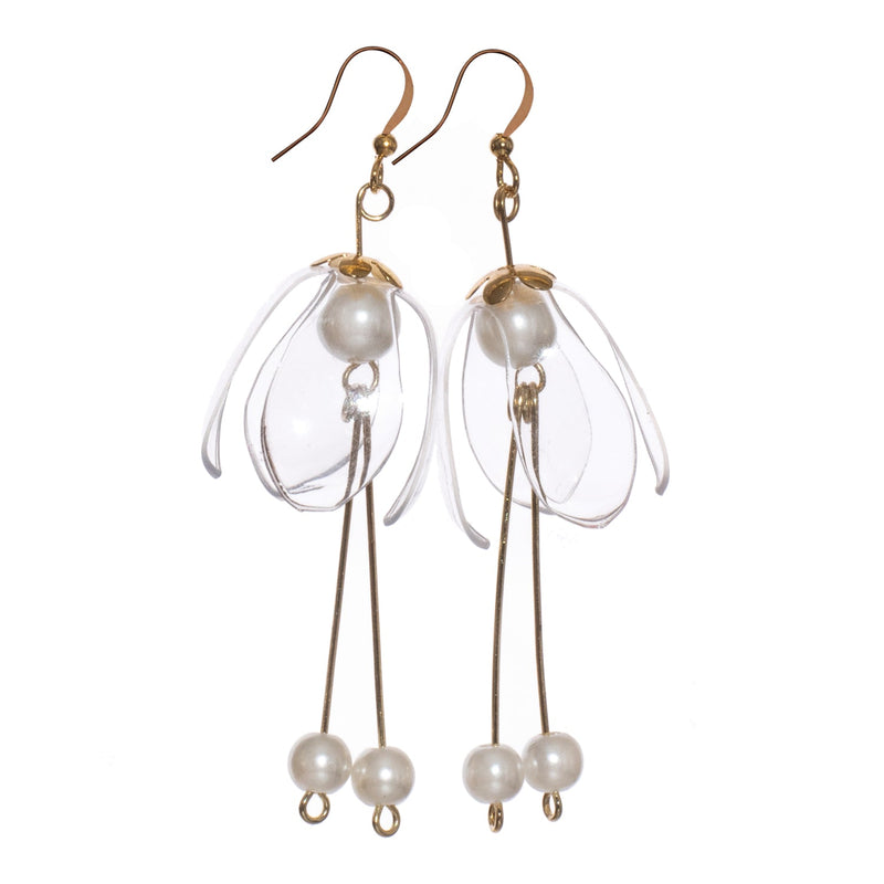 Nämä herkät käsintehdyt korvakorut esittävät ylösalaisin olevaa liljakukkaa, jossa on kirkkaat terälehdet, pehmeä valkoinen helmi ja kaksi pisaraa, jotka heiluvat kevyesti liikkuessasi.