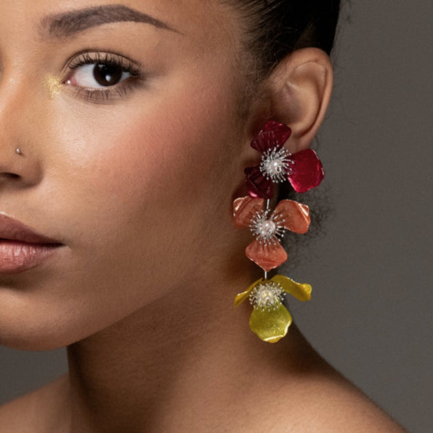 Flowers: recycled PET plastic bottles. Metal parts: 14k gold or silver-plated brass — allergy-friendly and nickel-free
