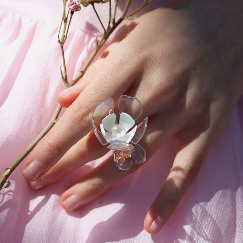 Upea kukallinen sormus hienostuneella tyylillä. Kultaviimeistellyistä ranskalaisista koukuista roikkuu kauniita kirkkaita kukkia, jotka syleilevät kiiltävää valkoista helmeä, jossa on pyöristetty kultaviimeistelty kärki. Juuri se sormus, jota tarvitset, kun haluat sanoa paljon, sanomatta liikaa!