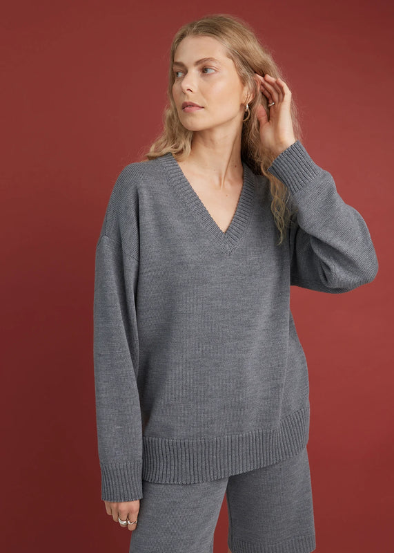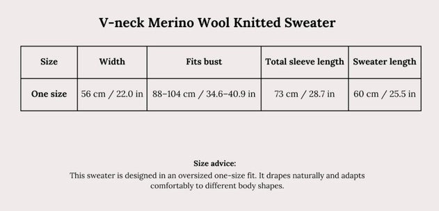 Vaivattoman ajaton pusero, jossa on rento V-pääntie, Ribbi hihansuut ja helma. Neulottu 100 % merinovillasta, jossa yhdistyvät luonnollinen lämpö, pehmeys ja kestävyys. Se on suunniteltu oversized yhden koon istuvaksi, joten se istuu kauniisti ja sopii eri vartalonmuotoihin helposti.