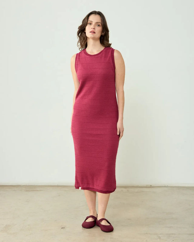 Crafted from 100% organic cotton in Portugal, this midi dress combines understated elegance with everyday comfort. The burgundy openwork knit offers visual interest while maintaining breathability, while generously proportioned straps and a semi-fitted silhouette provide flattering support across diverse body types. The versatile design transitions seamlessly from casual to refined occasions—layer with a denim jacket for effortless sophistication or wear solo for warmer days. A thoughtfully designed piece that prioritizes both aesthetic appeal and sustainable material sourcing.