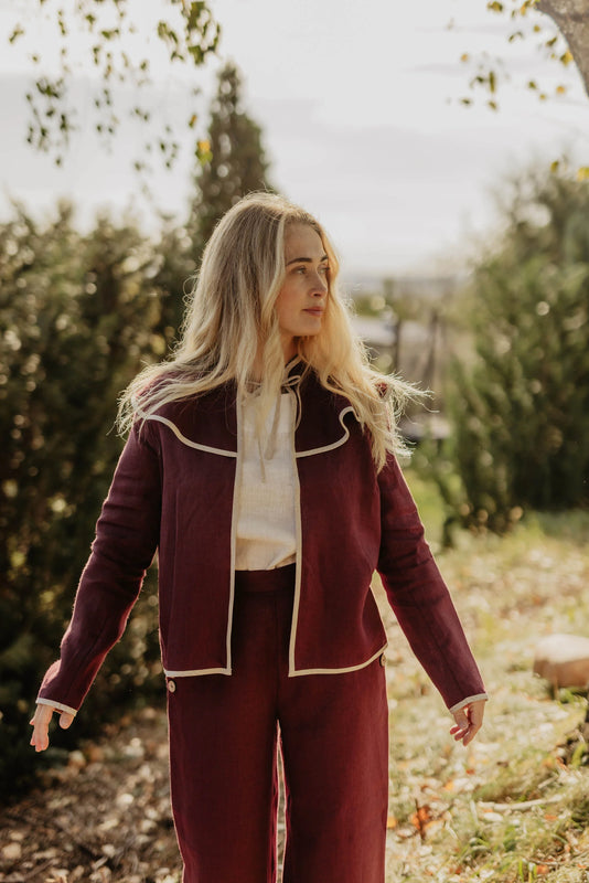 100 % baltian pellavasta valmistettu Hendaye-takki yhdistää hillityn hienostuneisuuden ja toiminnallisen muotoilun. Sen erottuva viittakaulus ja solmio edessä tuovat mieleen vintage-tunnelman säilyttäen samalla nykyaikaisen minimalismin. Kankaan luonnollinen hengittävyys ja rakenteellinen eheys tekevät siitä ihanteellisen kerrospukeutumisen vaatekappaleen siirtymävuosiin - se sopii yhtä hyvin aamun viileyteen kuin kerrospukeutumiseen. Tämä takki on suunniteltu pitkäikäiseksi, ja se mukautuu tyylikkäästi eri vuosien ja tilaisuuksien välillä ja ilmentää harkitun, hitaan muodin periaatteita.